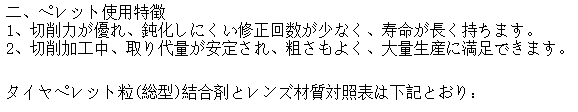 レンズタイプ | 耐摩耗度範囲 | 代表硝材 | 金屬結合剤 | 樹脂結合剤 | 大徑 | 小徑 | 大徑 | 小徑 | A | 80以下 | S-LAH66,S-LAH55, S-LAH58,S-LAH60, S-LAH64,TAFD5, TAFD30,LAC8,TAC8 | ZM24 ZM366 | ZM24 ZM30 ZM20 | ZR2 | ZR2、ZR3 | B | 80-150 | BSC7,BAC4,BACD, E-F,S-BSL7,S-BSM, S-BAL,S-BAH,S-TIM | ZM24 ZM366 ZM26 | ZM24 ZM30 ZM20 | ZR2、ZR3 | ZR2、ZR3 ZR7、ZR707 | C | 150-260 | S-TIH,S-LAM, E-FD1,FD60,FD110, E-FDS1,FDS90 | ZM26 ZM24 ZM21 ZM22 | ZM24 ZM10 ZM26 ZM20 | ZR3、ZR707 | ZR7 ZR707 | D | 260以上 | FCD1,PCD4, S-FPL,S-PHM | ZM21 ZM22 | ZR7K1000# | ZR707 | ZR707 ZR465 | G | 平面用ペレット | | | ZR717K1000# | H | 皿修正用ペレット | ZM23Q1000# ZM51Q1000# | |