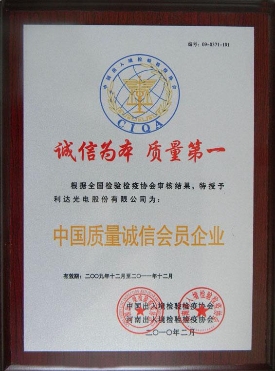 利達光電股份有限公司榮獲首批“中國質量誠信會員企業”榮譽稱號
