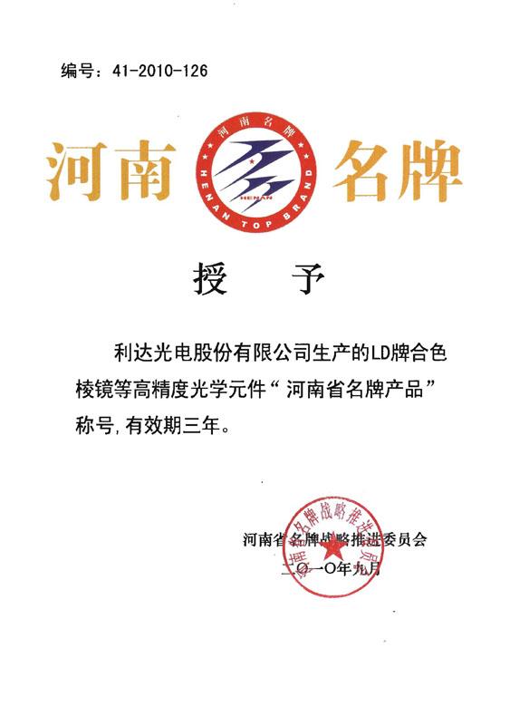 利達光電“LD”牌高精度光學元件榮獲河南省名牌產品