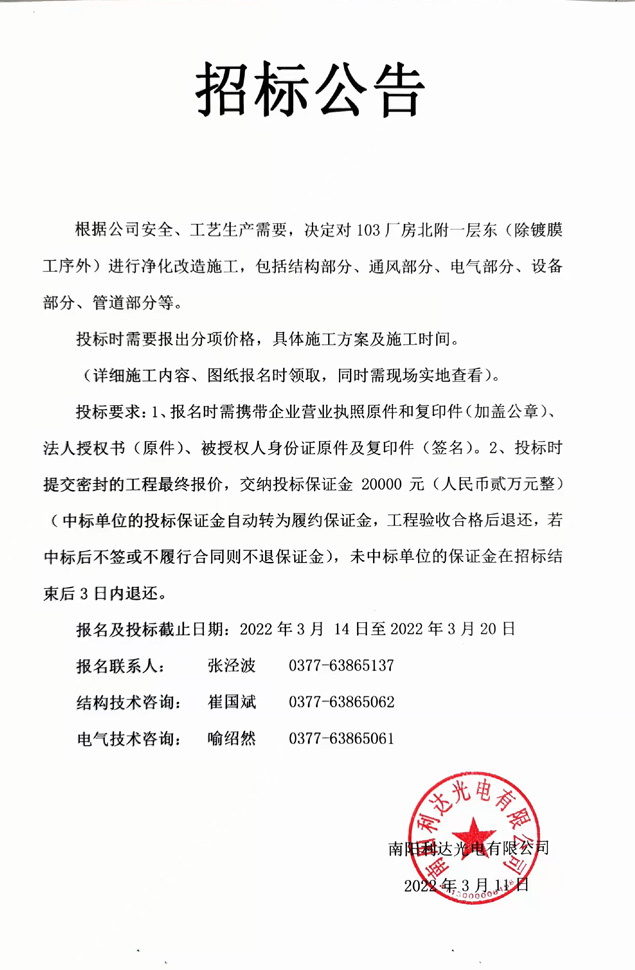 - (2022-09-29)光電新區三期廠房一層裝修施工的招標公告