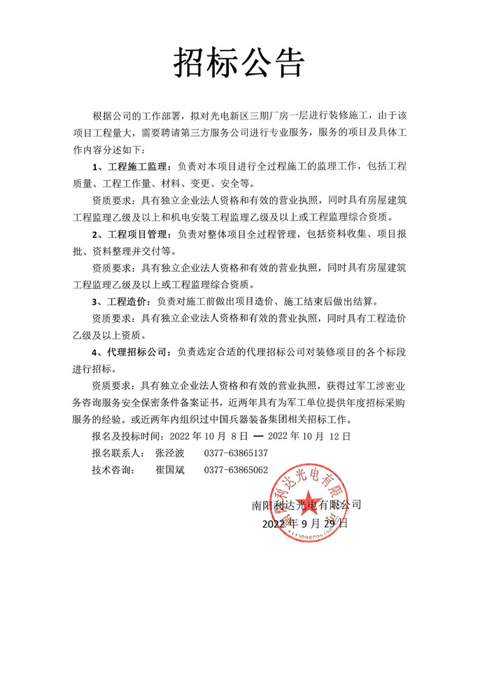 - (2022-09-29)光電新區三期廠房一層裝修施工的招標公告